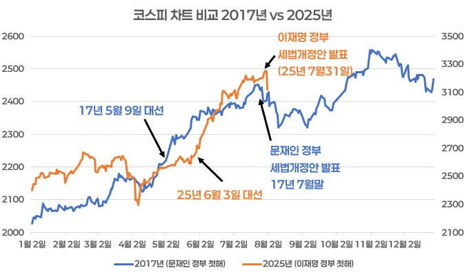 정치 리셋, 정책 발표, 글로벌 변수(특히 트럼프), 세법개정, 외국인 자금 변동 등 각종 이벤트들이 2017년과 2025년 모두 비슷한 타이밍과 방식으로 증시에 영향을 미쳤음.