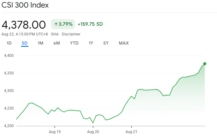 중국 본토 주식시장은 최근 미중 무역 관계 안정화가 위험선호 심리를 자극하면서 주간 상승을 기록했습니다. CSI 300 지수는 4.18% 상승하며 10년 만에 최고 수준으로 마감했고, 상하이 종합지수는 현지 통화 기준 3.49% 상승했습니다. 홍콩에서는 벤치마크인 항생지수가 0.27% 상승했습니다.