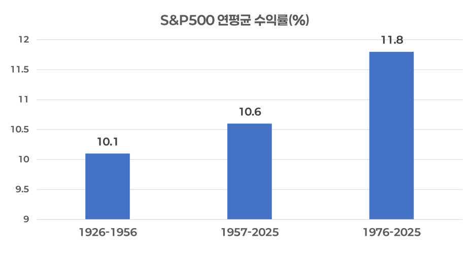 - 1976-2025 (Vanguard 인덱스펀드 시대): 연평균 11.8%의 수익률로 이전 대비 오히려 상승 추세.