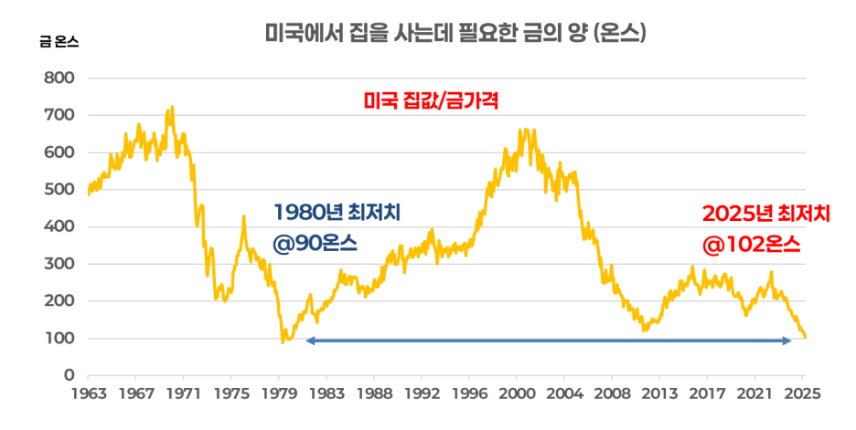 이는 금이 주택가격 대비 많이 상승했다는 것을 의미한다. 실제로 지난 3년 동안 금 가격이 무려 133% 상승하면서, 주택을 구매하는 데 필요한 금의 양은 180온스나 급감했다.