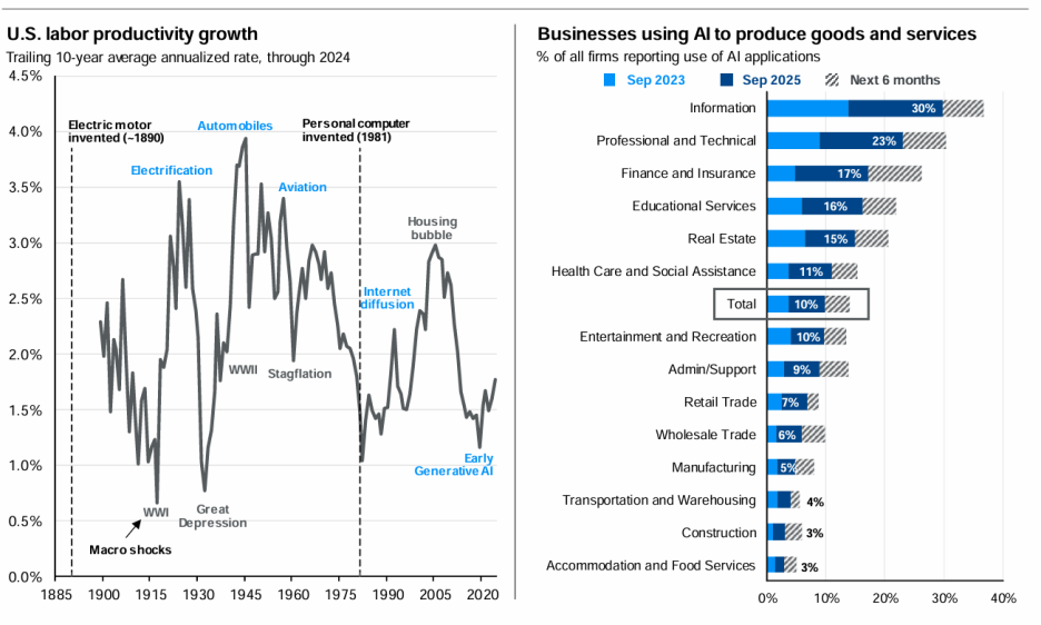 2025년 9월 기준, 미국 기업의 약 10%가 AI를 활용하여 제품이나 서비스를 생산하고 있으며, 특히 정보기술(30%), 금융(17%), 전문서비스(23%) 분야에서 도입이 활발합니다.