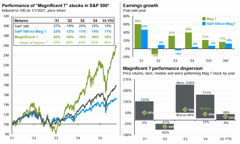 "Magnificent 7" 기업들(Apple, Microsoft, Alphabet, Amazon, Nvidia, Meta, Tesla)은 2025년 들어 18% 상승하며 시장을 계속 견인하고 있습니다.
