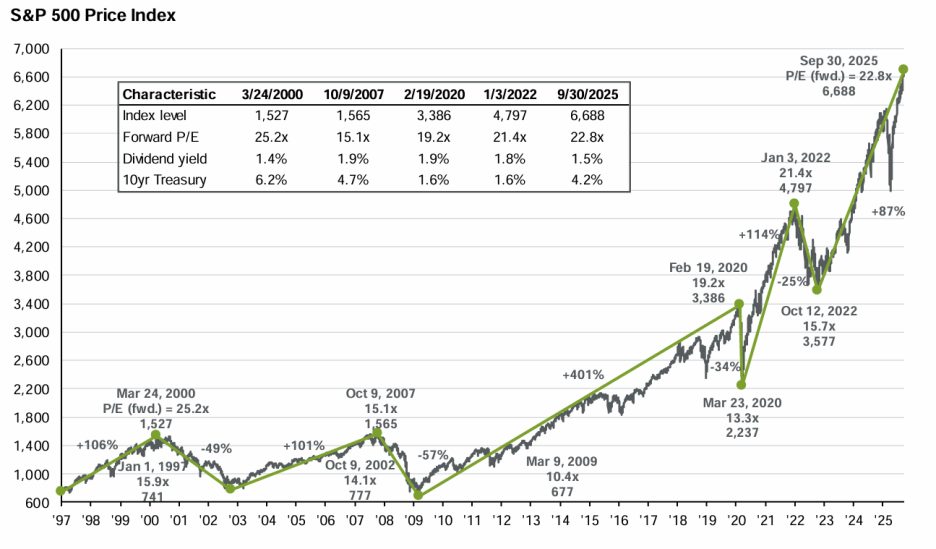 S&P 500 지수는 2025년 9월 30일 기준 6,688포인트를 기록했으며, 선행 P/E 비율은 22.8배입니다. 이는 30년 평균인 17.0배를 크게 상회하는 수준으로, 역사적으로 높은 밸류에이션 구간에 위치해 있습니다.