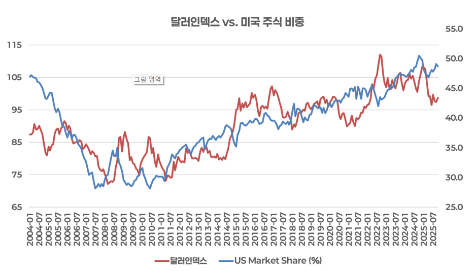 하지만 역사는 운율을 맞춘다. 극단적인 쏠림 현상은 오래 지속되지 않았다. 50%라는 미국 시장 비중, 고점권의 달러, 극단적으로 벌어진 밸류에이션 격차, 그리고 소수 종목에 대한 극심한 집중은 과거와 유사한 패턴을 보이고 있다.