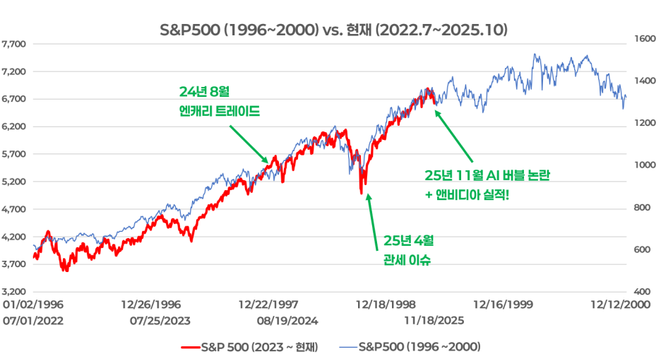 그러나 차트를 다시 한번 살펴보면 흥미로운 사실을 발견할 수 있다. 업데이트된 S&P 500 비교 차트는 1996~2000년 닷컴버블 시기와 현재(2022.7~2025.11)의 흐름을 겹쳐 보여준다.