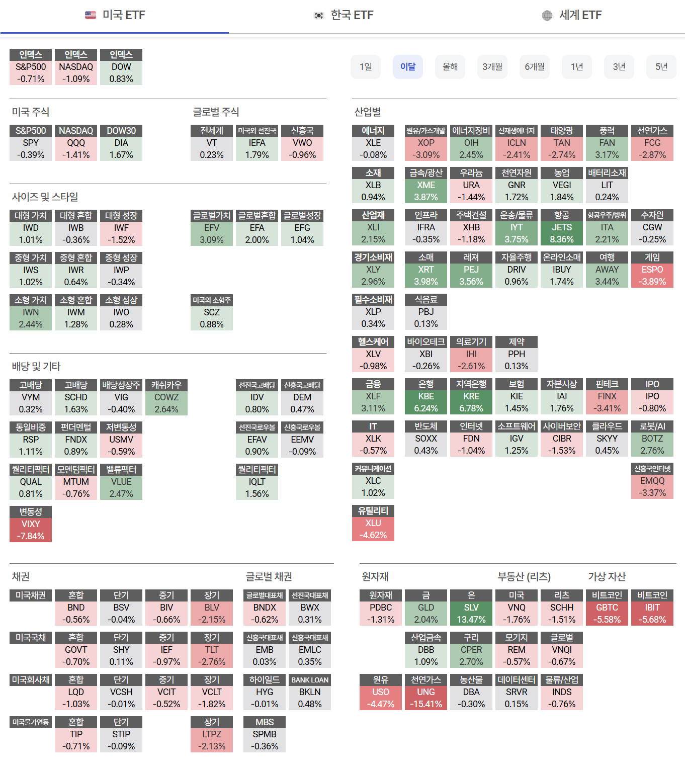 미국 주식 ETF가 306억 달러를 끌어들였고, 해외 주식 ETF가 98억 달러로 뒤를 이었습니다. 레버리지 ETF는 9억 6,500만 달러의 유출을 기록했고, 인버스 ETF는 4억 2,700만 달러를 잃었습니다.