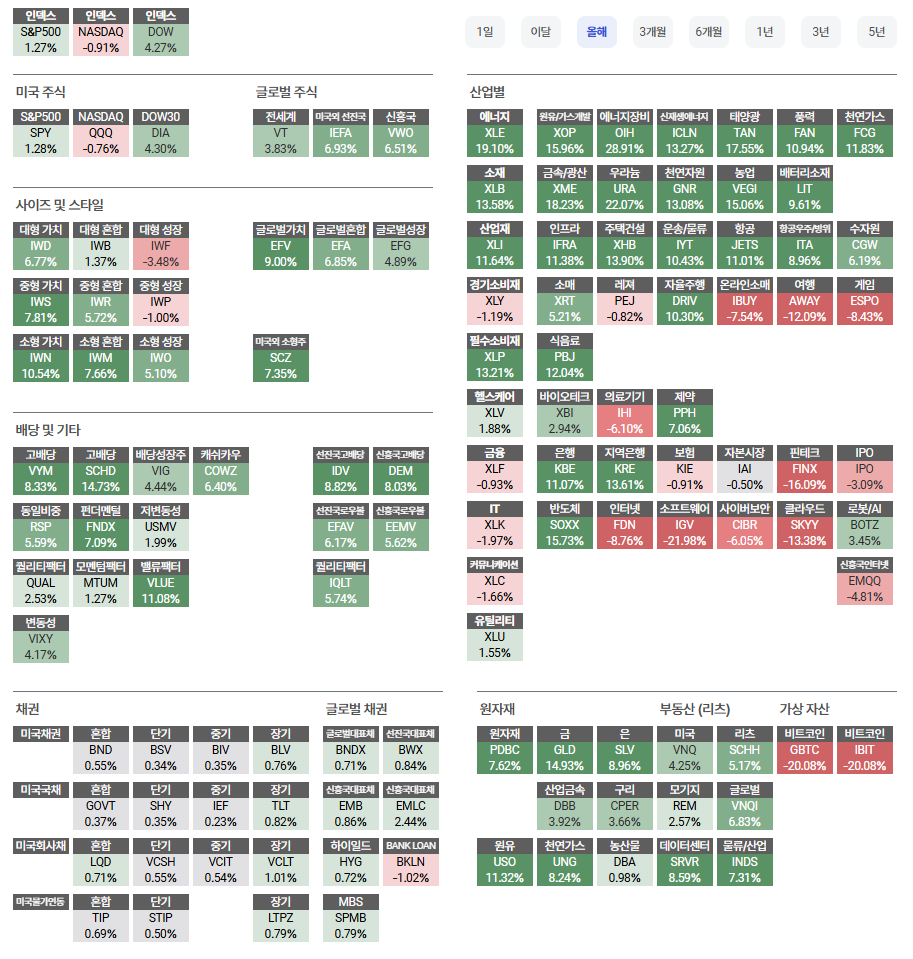 - 수익률 비교: 연초 이후 VXUS(+8.9%)와 IEMG(+10.4%)는 미국 시장의 핵심인 VOO(+1.8%)를 크게 앞지르고 있습니다.
